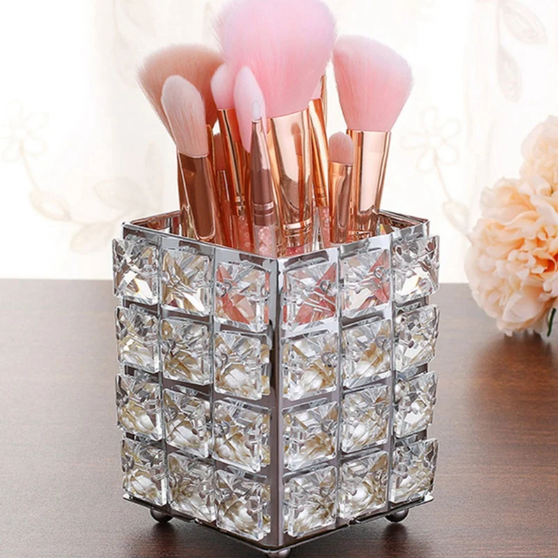 Review Top Metal Crystal Square Makeup Organizer Box Brush Sorting Storage Tube Sorting Jewelry Desktop Decora