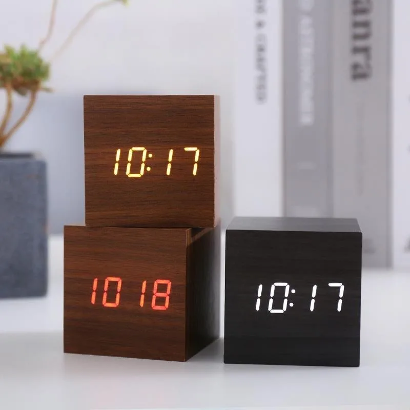 Multi-function Digital Led Mini Alarm Clock Cube Creative Square Wood Clocks Smart Sound Control De
