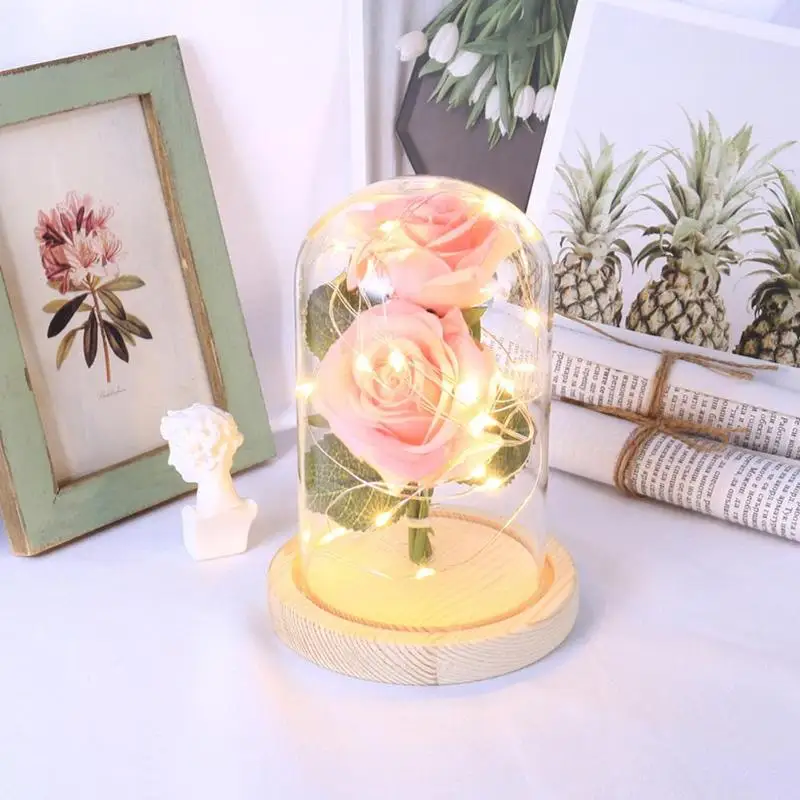 Rose 20 LED Copper Wire String Light Glass Dome Wooden Base Night Lamp Home Room Desktop Decoration